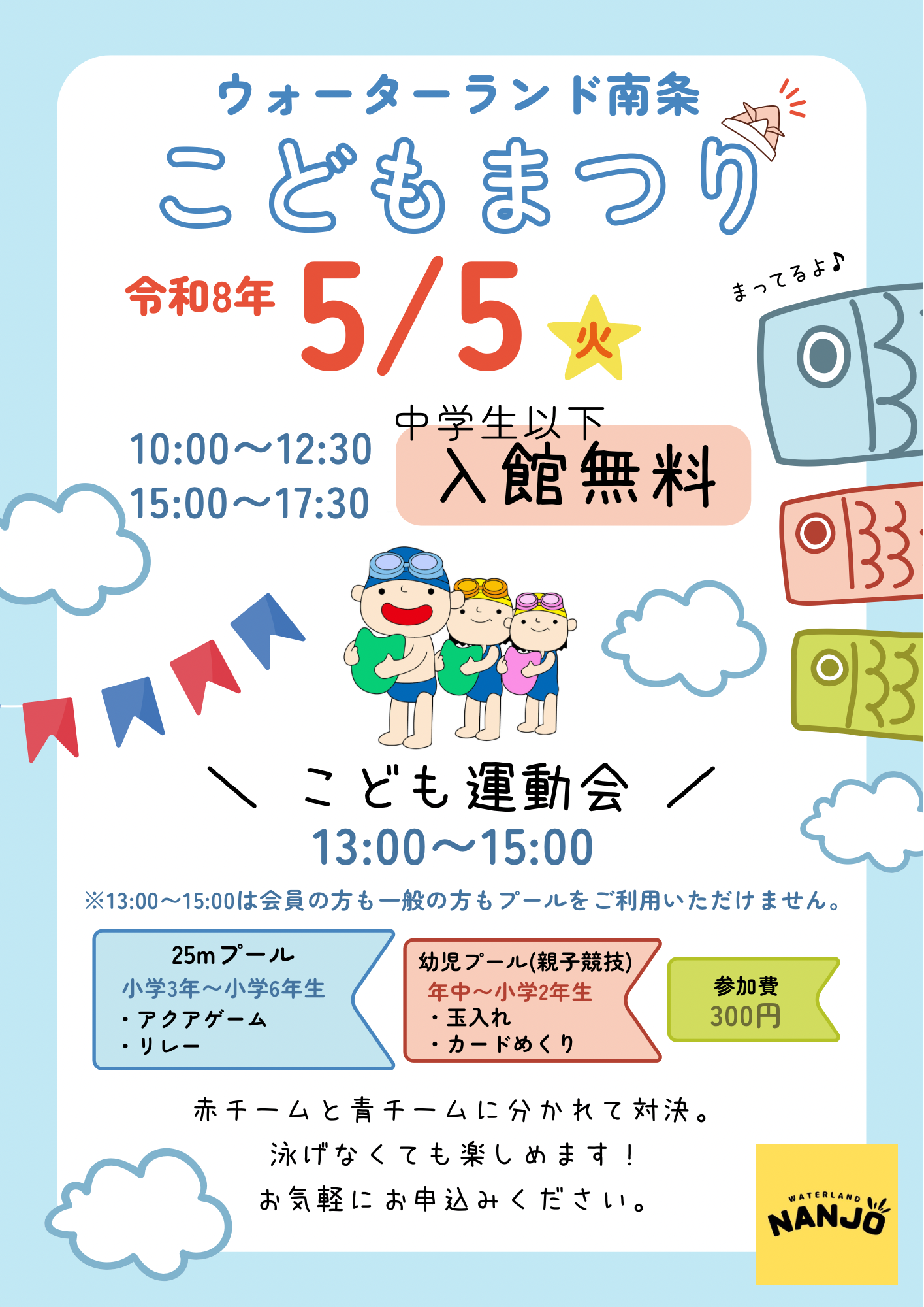 *こども運動会は定員になり次第、受付を終了いたしますので予めご了承ください。また、お電話での申込受付はいたしかねます。当館フロントにて料金を添えてお申し込みください。